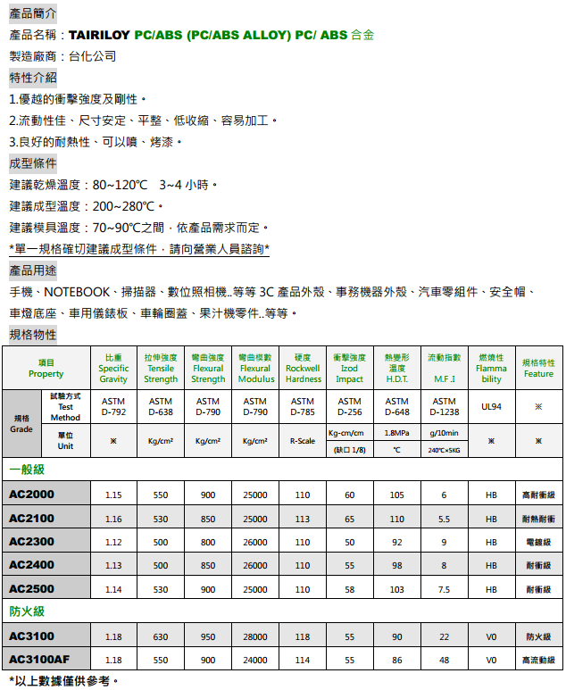 AC3100詳細資料筆記型電腦外殼、光碟機Loader及 Tray盤、螢幕外殼、數位相機外殼、事務機器外殼、家用電器外殼、消費性電子元件耐燃、無氯、溴、銻加工建議參數 SDS UL RoHSSVHC 環保證明 物性表