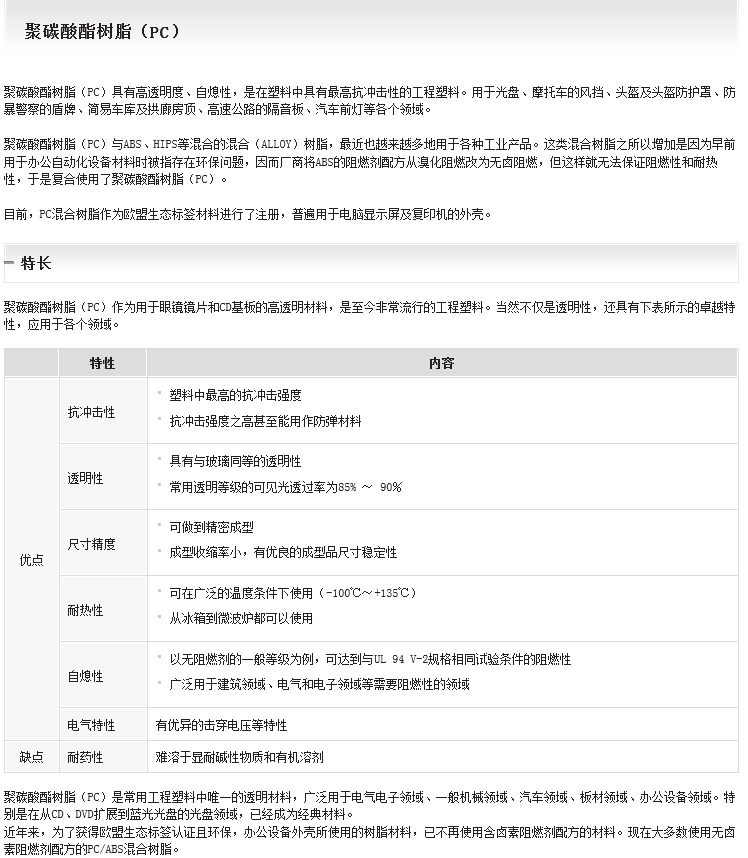 [導讀:]聚碳酸酯樹脂(PC)聚碳酸酯樹脂(PC)具有高透明度、自熄性,是在塑料中具有最高抗沖擊性的工程塑料。用于光盤、摩托車的風擋、頭盔及頭盔防護罩、防暴警察的盾牌、簡易車庫及拱廊房頂、高速公路的隔音板、汽車前燈等各個領域。聚碳酸酯樹脂(PC)與ABS、HIPS等混合的混..